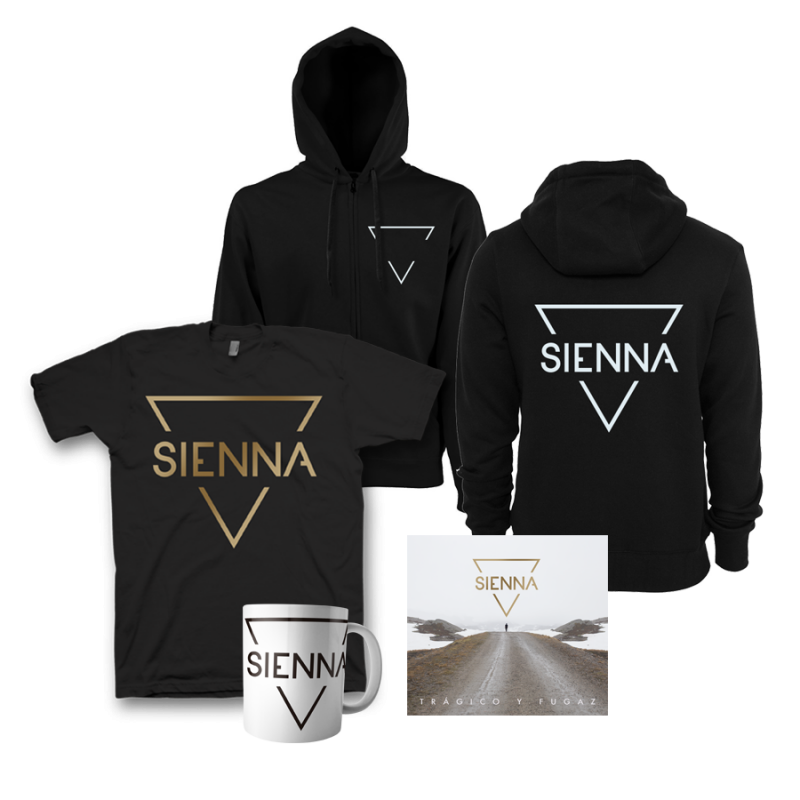 Incluye el disco en formato digipack ‘Trágico y Fugaz’ junto a una camiseta de manga corta, una sudadera con capucha y cremallera y una Taza.