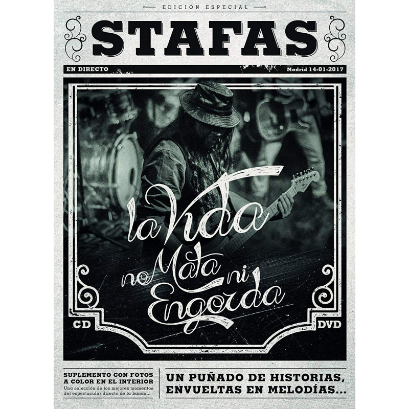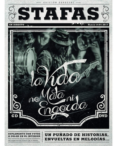 Nuevo CD + DVD de Stafas titulado 'La Vida no Mata ni Engorda'. Incluye fotos a color en el interior. Grabado en Directo el 14 de Enero de 2017 en su concierto en Madrid. 'Edición Especial'