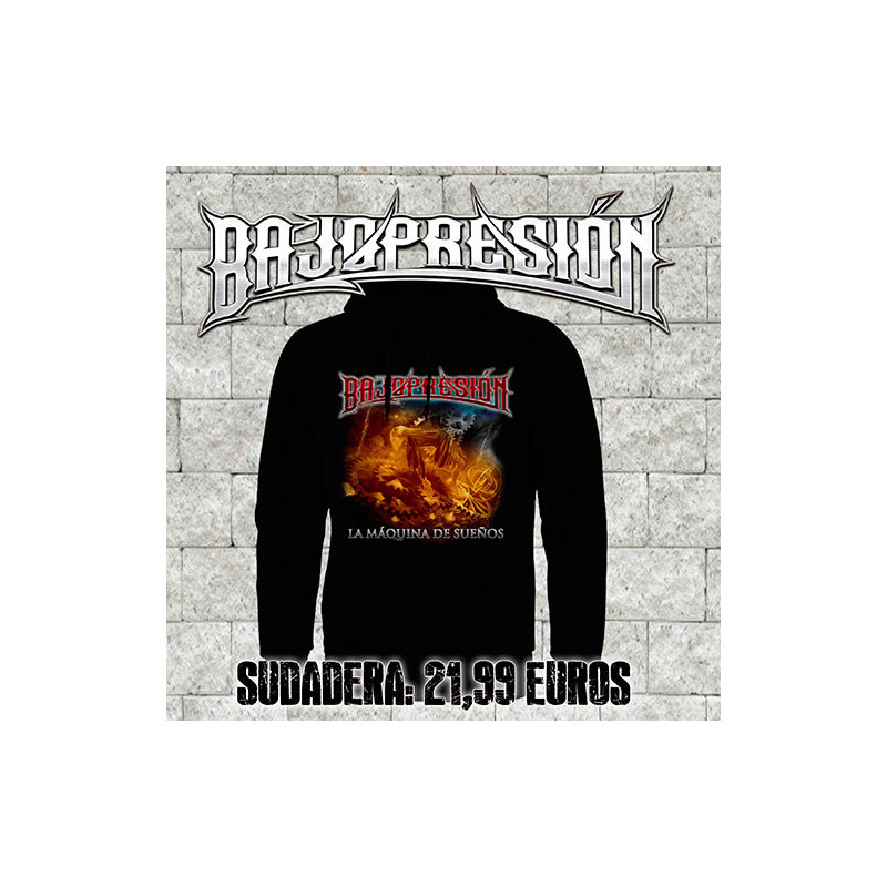 Sudadera con capucha color negro de la banda BajopresióN disponible en tallas unisex (chico,chica)