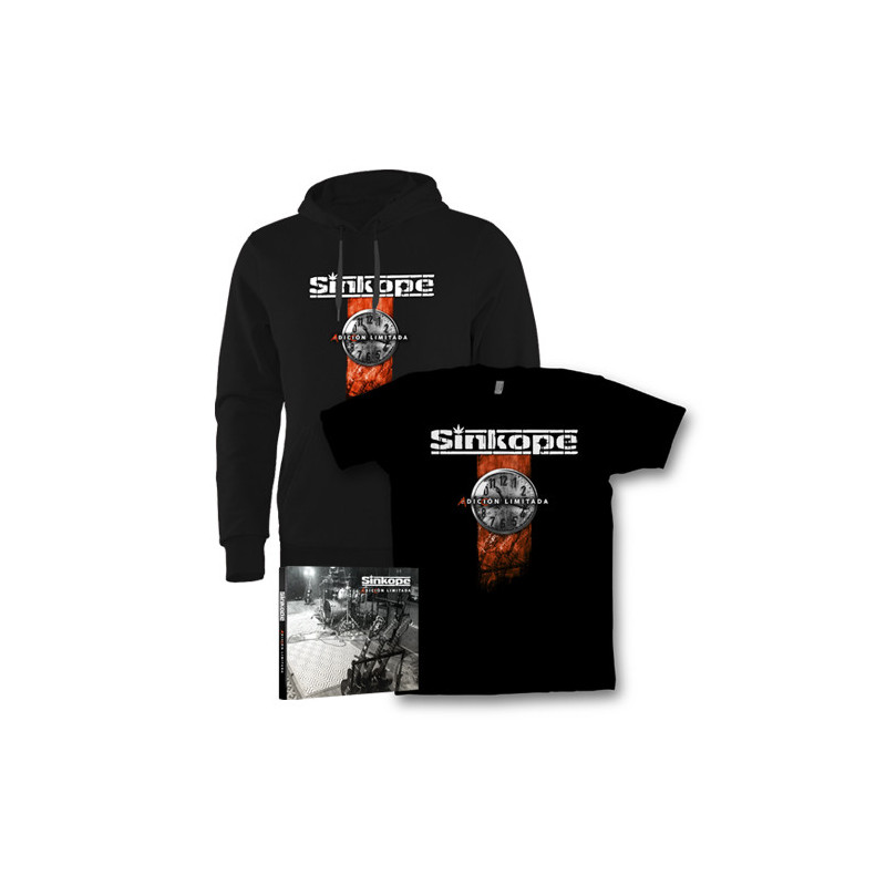 Este pack especial incluye además del nuevo dvd una camiseta negra modelo 'Reloj' impresa en el pecho y disponible en tallas de chico, chica (manga corta y tirantes) y niño, una sudadera con capucha color negro modelo "Reloj" disponible en tallas unisex (chico, chica)