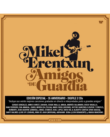 Mikel Erentxun, celebra sus “35 años de carrera” con una regrabación en “directo” de sus 20 mejores canciones, y rodeados de “20 grandes artistas”, “Amigos de Guardia” recoge sus 20 mayores éxitos desde Duncan Dhu hasta ahora, rejuvenecidos de una manera sorprendente, consiguiendo que canciones míticas se vuelvan a convertir en nuevos éxitos. Esto ha sido posible en gran medida, a la producción de Ricky Falkner y a la grabación y mezcla de Jordi Mora y las colaboraciones tan especiales en cada uno de los temas.