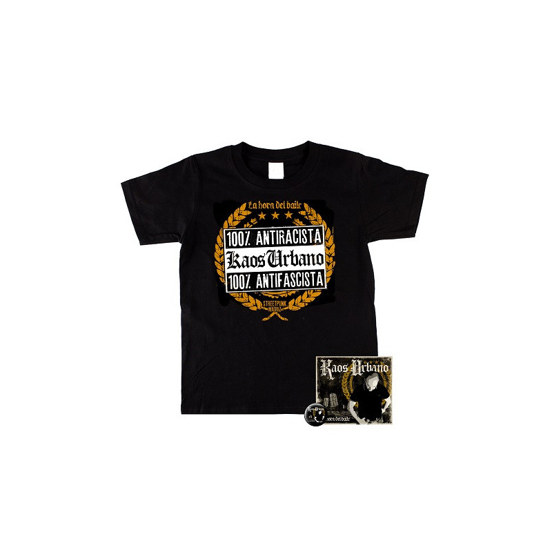 El pack incluye el Cd La Hora del Baile, una camiseta de manga corta modelo 100% Antifascista disponible en tallas de chico, chica y unisex niño y una chapa de la banda.