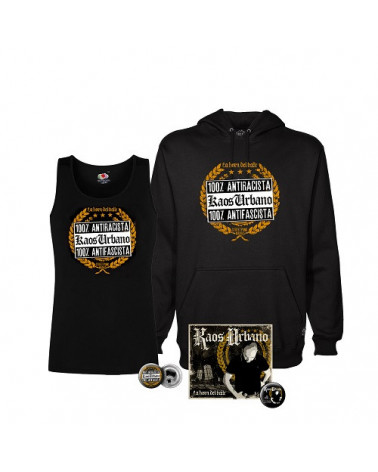 Kaos Urbano - Pack Rebelión+Camiseta tirantes 100% Antifascista+Chapa+Sudadera con capucha+Abrebotellas